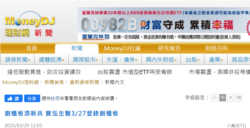 創櫃板添新兵 寶泓生醫3/27登錄創櫃板