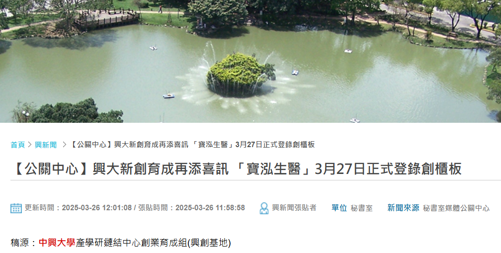 為爭取更多資金加速公司營運發展,「寶泓生醫」將於114年3月27日正式登錄創櫃板(股票代號:7671;產業類別:生技醫療業),積極朝資本市場邁進。欲了解更多「寶泓生醫」資訊,歡迎與中興大學產學研鏈結中心(興創基地)聯繫(startup@nchu.edu.tw/04-2284-0832)。